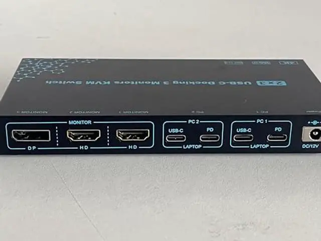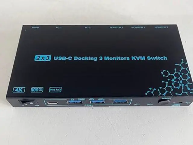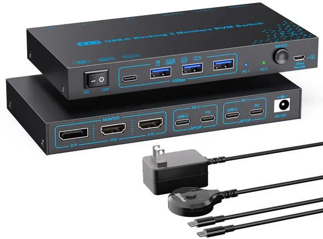 USB 3.0.: For more stable operation, please plug the included 12V/1A power adapter into DC/12V port ^^ Support 100W PD Fast Charging for LaptopsThe 3 monitors KVM switch for 2 laptops features 100W power delivery (PD) port, just plug a 100W laptop charger from socket to the relevant PD port, which can keep your laptop charged while you work or play. Say good bye to the the hassle of having limited USB-C ports on your laptop.: 100W actually powers the laptop at 73~80W, because both device and lines will consume power ^^ Wide Compatibility & Flexible Switching WaysThe 2 laptops 3 monitors Type-C docking KVM switch works smoothly with Windows, macOS, Linux, and Chrome OS. The switching method is very flexible, you can easily switch the signal between the 2 laptops in seconds through the Panel Button & Wired Remote Controller, clear LED indicators show the active computer ^^ Warm Tips () To get 3 screens output from laptops and make USB peripheral devices work properly, please ensure the USB-C port of the laptop supports DP Alt function(Video&Data&PD Transfer); () For general laptops or computers, this 3 monitors