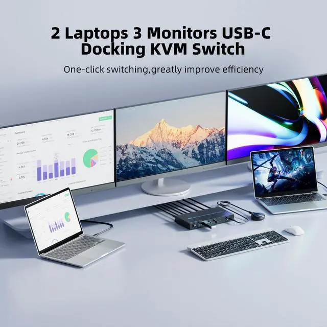 2 Laptops 3 Monitors USB-C Docking KVM Switch The 3 monitors 2 laptops MST dual USB-C docking KVM switch acts as a powerful USB-C docking station and a 3 monitors 2 computers KVM switches! While expanding your USB-C laptop into three external monitors (2* HDMI & 1*DP) and 4 USB 3.0 Hubs, it also allows you to easily switch between 2 laptops to share 3 monitors and four 10Gbps USB peripherals. Save money, simplify your setup, and boost productivity with a clean, organized workspace ^^ MST Dual 4K@60Hz & One 1080P@60Hz OutputThe triple monitor 2 laptops KVM switch supports up to dual 4K@60Hz & one 1080P@60Hz outputs, effortlessly extending a single monitor to three external screens.