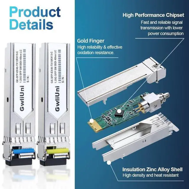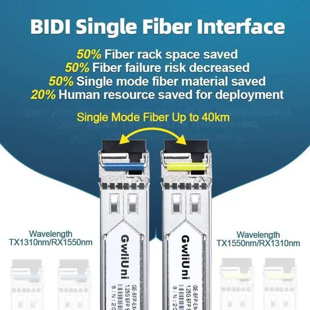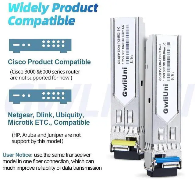 BIDI technologysupport BIDI single fiber data transmission, which much improves the efficiency of cabling and saves 50% fiber rack space ^^ High performance single mode BIDI 1.25 Gigabit SFP transceiver, supports up to 40km fiber length connection and 0~70 operating temperature. More than 1000k+ pcs SFP are already deploy in global market ^^ Widely compatible the SFP transceiver are widely compatible with Cisco products(Cisco 3000 & 6000 series router are not supported) and Netgear, MikroTik, Ubiquity, DLink etc., ( Not recommended for HP, Juniper and Aruba products). The fiber module also works well with switch, router, media converter and more gigabit SFP optic ports ^^ 100% aging testingthe gold finger of SFP module are carefully examined to reach the perfect combination of circuit assembly precision.