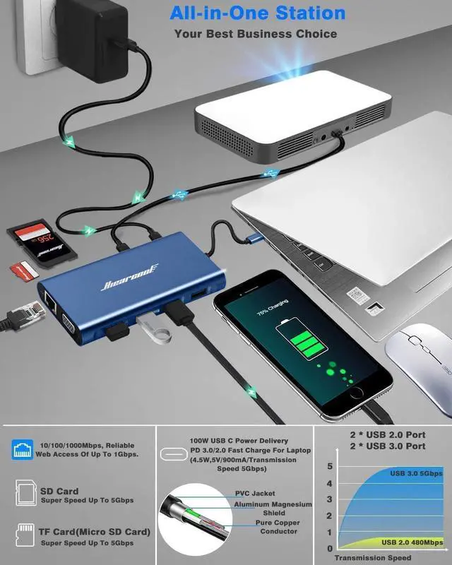 USB C hub: Equipped with the newest generation super smart chip, up to 100w design shortens charging time, power transfer 3.0 (backwards with PD 2.0 ) preventing overload, short circuit, voltage regulation, temperature protection ^^ Fast Speed