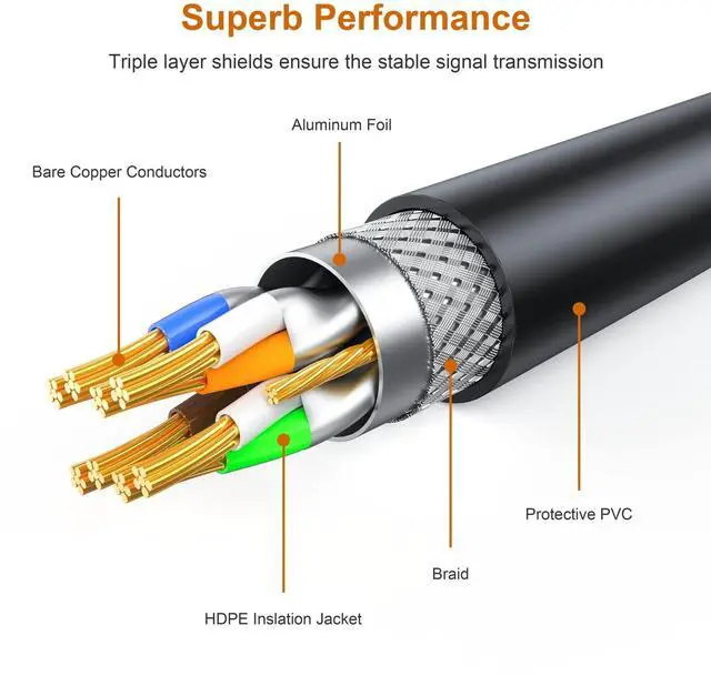 Direct Burial Heavy Duty: The Triple layer shieldeds ensure Cat7 Outdoor Ethernet cable is super-efficient in reducing EMI/RFI Interference and provide highest fidelity for long distance data transmission. With upgraded PVC, ethernet cable cat 7 is waterproofed & anti-corrosion and more durable & flexible for heavy duty work. Can be buried directly. Suitable for both indoor and outdoor use ^^ High