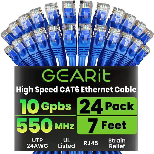 High-Performance Cat 6 Ethernet Cable Pack GEARit's 24-pack of 7 ft Cat6 ethernet patch cables features 24 AWG UTP stranded conductors twisted in an X-structure spline to minimize crosstalk and deliver full 10 Gbps bandwidth - future-proof network cables for home, office, data-center, and server use. ^^ Advanced Cat6 Technology Engineered to meet or exceed TIA/EIA-568-C. 2 standards, these Cat6 ethernet cables offer up to 550 MHz of throughput at a Cat5e price. Fully backwards compatible with Cat5/5e networks and ready for 10-Gigabit Ethernet applications. ^^ Reliable, Secure Wired Connection Say goodbye to Wi-Fi dropouts - this Cat 6 network cable (aka ethernet cable Cat 6 or RJ45 patch cable) provides rock-solid LAN connections for PCs, servers, routers, printers, gaming consoles, and more, ensuring low-latency, interference-free data transfer.