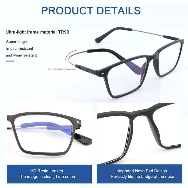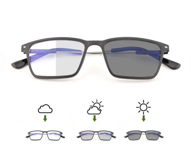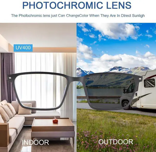 Photochromic LensPhotochromic Sunglasses lens will change from clear to black in response to the intensity of the ultraviolet, also with high transmittance (93%). Effectively maintain a suitable brightness to protect your eyes in strong sunshine. The darkness of lens color depends on UV intensity! Indoors, you can wear it as anti-blue light glasses: Filter high level blue light from digital screen of computer, phone and TV. Outdoors, you can use it as sunglasses. ^^ Blue Light and UV Protective45% Blue Block Rate. If you face computer/phone screens too long or over using your eyes for any reason, Alleviates visual fatigue and discomfort from long periods of web surfing, gaming and working under fluorescent lights with glare reduction. UV400 protection can block 100% of UVA and UVB radiation and fully protect against harmful ultraviolet rays. ^^ High Quality Titanium FrameThe temples are made of durable titanium material, light weight, high strength and good corrosion resistance. Integrated nose pad design, The nose pads are ergonomically designed for a comfortable fit, non-slip and anti-shedding, and are elegant and gentle to wear without pressing the nose. The frame perfectly balances visual appeal and long-lasting comfort, making it an ideal wearing experience for those who love spending time in the sun. ^^ Durable Clear LensesPEEPAI Photochromic anti-blue light glasses adopt high-definition clear lenses with excellent wear resistance and scratch resistance. They have high light transmittance and minimize chromatic aberration, providing a realistic visual experience.