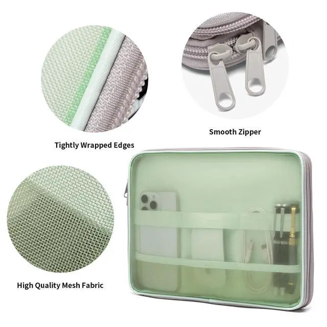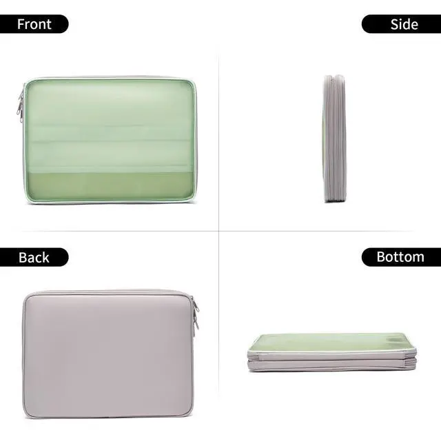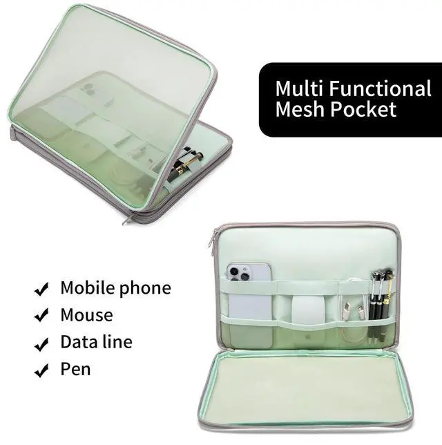Clear-Visibility Mesh Front PocketUnlike ordinary laptop sleeves, our design features a transparent mesh pocket with three slip compartments + elastic straps to securely organize your mouse, cables, phone, pens, and notepad - keeping everything neatly organized and within reach.