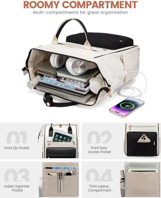 [Wide Open Design Laptop Bag]This laptop bag for women features wide-open main compartment for instant access to your 15.6" laptop. With 2 compartments and 16 strategically placed pockets, it effortlessly organizes textbooks, medical supplies, and all your travel essentials - ensuring users can locate items in seconds. Perfect as work bags for women or nurse bag, teacher bag, travel bag, college backpack, etc. ^^ [TSA Certified Carry On Backpack]Ultra-lightweight Large Capacity airline approved backpack( 11.8"L 7.1"W 16.5"H )Weighing only 1.83 lbs. Designed to reduce shoulder pressure while maintaining a 23L large capacity.