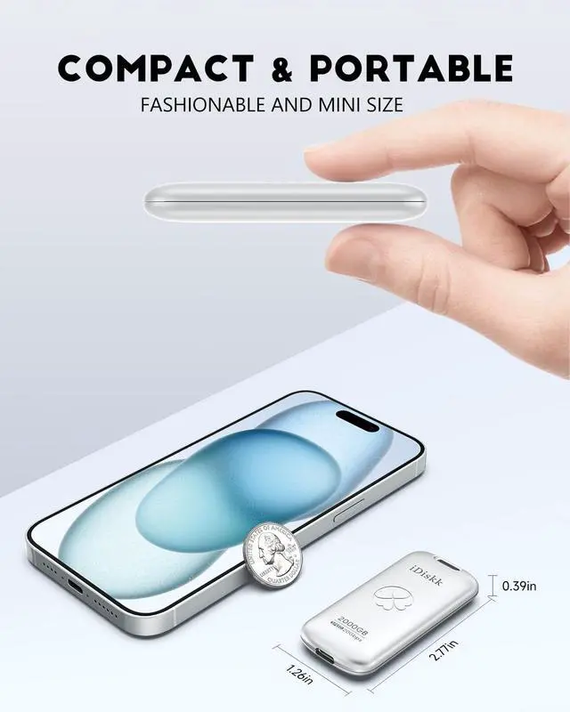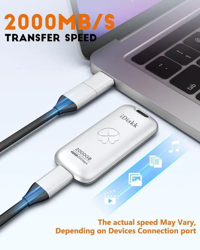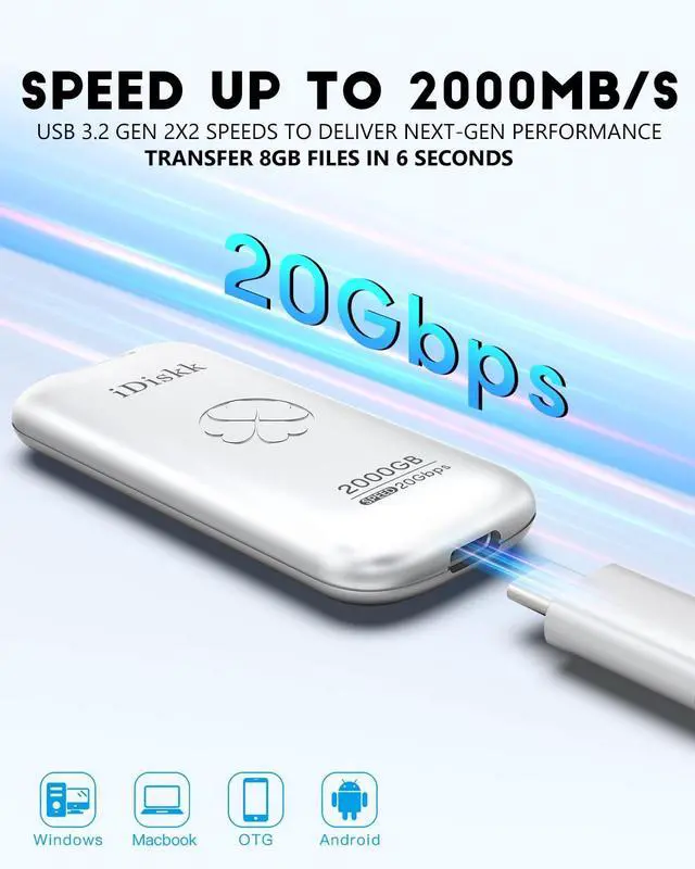 HIGHER-SPEED DATA TRANSTER: With latest SSD tech (more faster than TF card or flash), which greatly boost data transfer speed up to 2000MB/S (reading) and writing speed can reach 950MB/S, help to save more time when transferring and uploading files. ^^ Work Fast and Dependable, Say goodbye to lag Get ready for a revolution in data transfer by iDiskk Solid State Hard Drive with performance featuring up to 2000MB/s read/write speeds in a portable drive, Save a plent of time storing and transferring data. ^^ Universal Compatibility+Reliable Quality iDisk Portable SSD is your ideal storage expansion solution. It complies with USB 3.2 Gen2X2, offering both USB-C and USB-A (USB-C) cable with speeds of 20Gbps OTG function making this external ssd compatible with a wide range of devices such as Windows, Mac, Android, iPad, PC, Linux, PlayStation and Xbox gaming consoles etc ^^ Pocket size, Portable and Powerful With High-end zinc alloy material to ensure that iDiskk SSD with drop protection and dust resistance. handy, lightweight form factor for easy, on-the-go storage which is reliable enough to take on with you anywhere. ^^ What you get1pcs Solid State USB drive, 7x 24 friendly customer service and 30-days 100% refund if any displeasure.