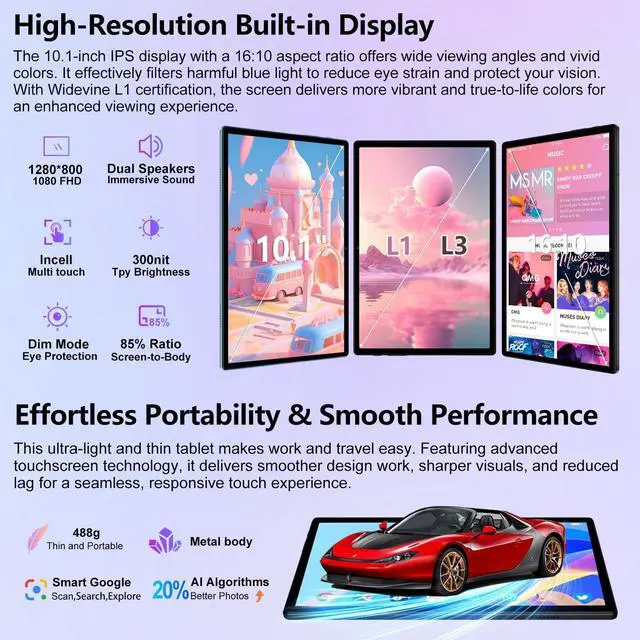 OS & Fast Connectivity: E9 tablet pc features ultra-thin metal body design, maintain reliable connections with Dual-band Wi-Fi ( 2.4G & 5G), Bluetooth 5.0, and GPS. The Google-certified Android 15 OS offers split-screen, casting TV, widgets, and secure face unlock for a smarter experience ^^ Vibrant HD Display & Premium Streaming: Enjoy crisp visuals on the 10.1 -inch HD screen and immersive sound from dual stereo speakers. Widevine L1 certification enables seamless HD playback on popular streaming services. Effortless video calls & photos with 5MP+8MP cameras ^^