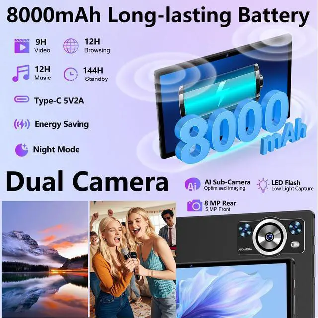 Long-Lasting Battery & Productivity Bundle: 10.1 inch tablets stay productive for extended periods with the high-capacity 8000mAh battery. Transform into a mobile workstation with the included keyboard & mouse, perfect for remote work, study, or creative tasks ^^