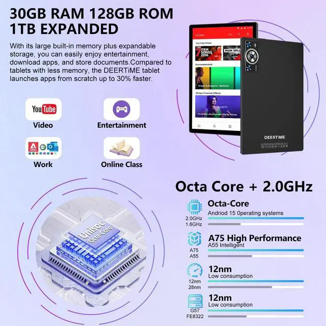 Unmatched Performance & Storage: DEERTiME tablet power through tasks with a 2.0GH z Octa-Core CPU, massive 30GB RAM, and 128GB internal storage. Expandable up to 1TB via microSD for apps, files, and media perfect for heavy multitasking ^^ Android 15
