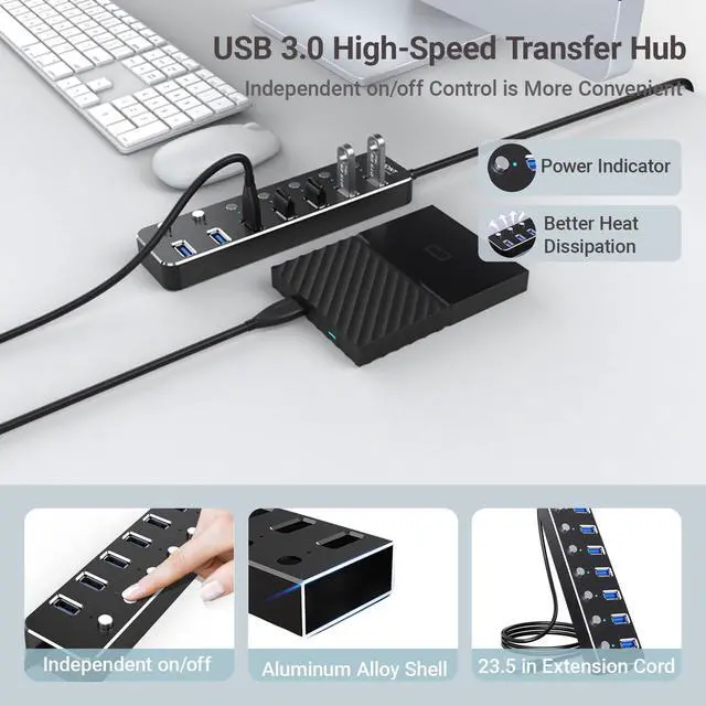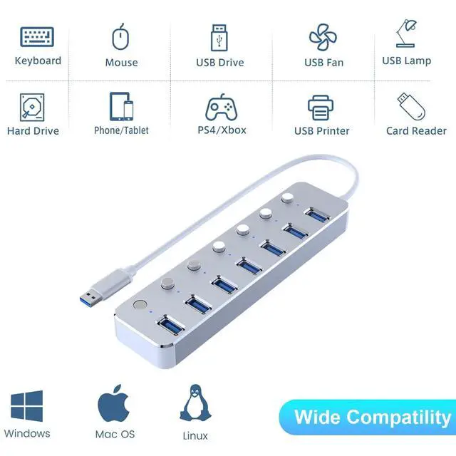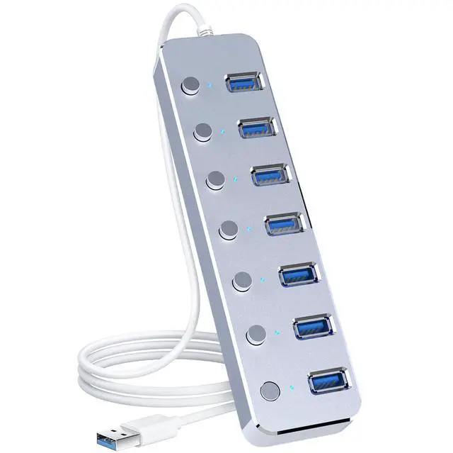 ^^ Individual On/Off Switches with LED IndicatorsEach port comes with its own power switch and LED light, giving you full control over each connected device. Save energy, manage power flow, and avoid unnecessary wear on your devices. ^^ Compact & Portable Just 6.5 Inches LongUSB port extender slim 6.5 -inch silver body (fits in palm) + a flexible 2ft (60cm) cable effortlessly tucks into laptop bags, backpacks, or desks for clutter-free setups at work, cafes, hotels, or creative studios. ^^ SuperSpeed USB 3.0 for Fast Data TransfersAll 7 ports support USB 3.0 speeds up to 5Gbps, making file transfers, streaming, and syncing faster and more efficient.