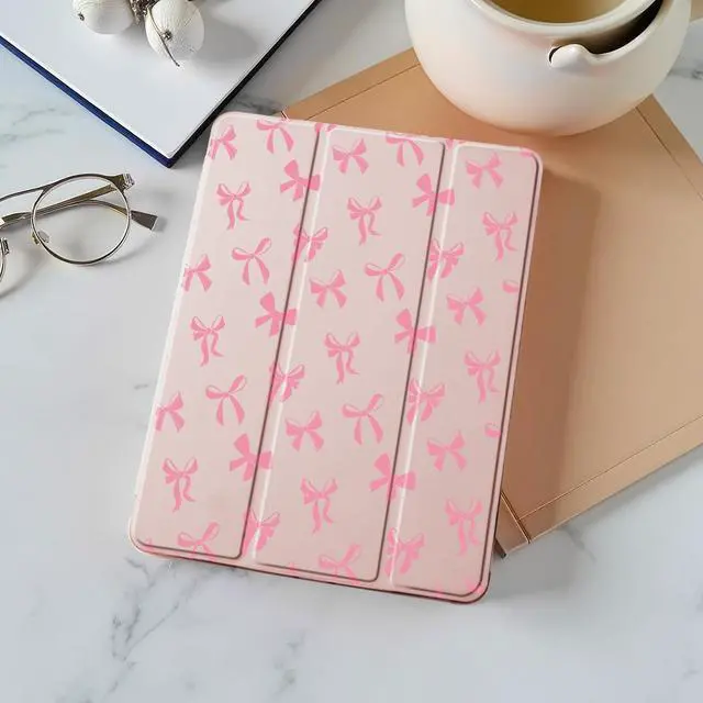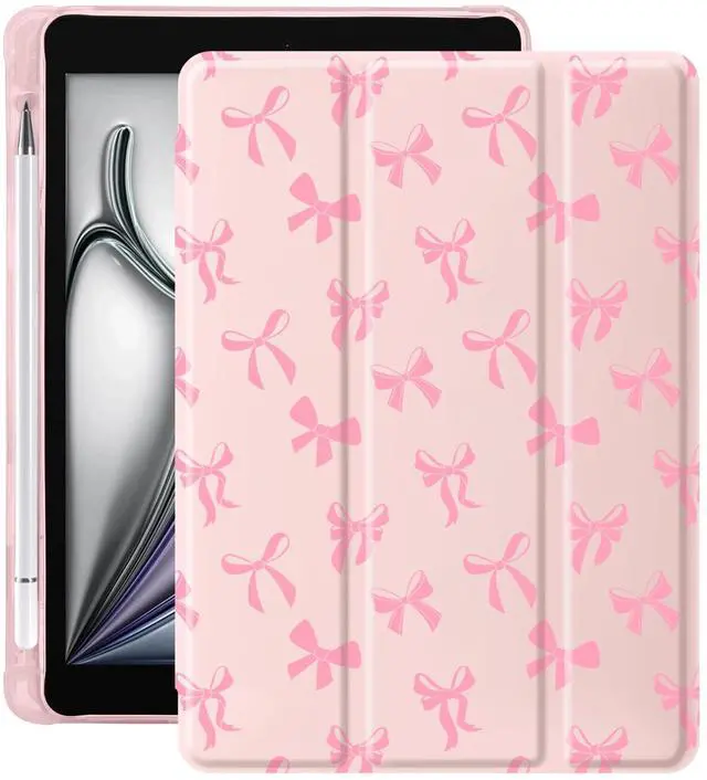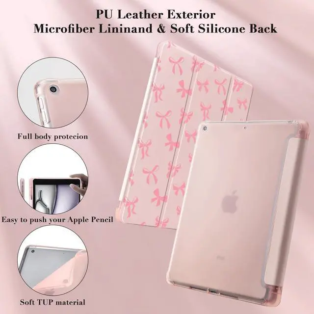Idocolors Cute Pink Bow Pad Case for 10.2 Inch iPad 9th/7th/8th Generation, Clear TPU Stand Back Cover with Pencil Holder, Girly Pink Auto Wake/Sleep Adjustable Protective iPad 2021/2020/2019 Case
