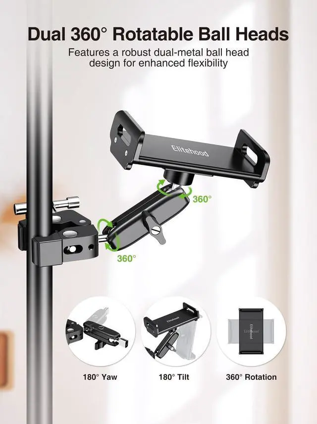 Combined with two 360 rotatable ball heads, you can easily adjust your iPad to any viewing angle and position for optimal, viewing, such as Horizontal, Vertical, Face Upward and Downward, Tilt, Sideway Mount or Front Mount. The screw knob enables quick and easy fastening of the ball heads. ^^ Excellent CompatibilityEquipped with the most advanced aluminum iPad holder, elitehood iPad microphone stand mount fits devices from 4.7 to 13 inches with or without cases, including 2024 iPad Pro 13 12.9 11, iPad Air 13 11, iPad Air Generation 5 4, iPad Generation 10 9 8 7 6, iPad Mini 6, 5, 4 and Samsung Galaxy Tab S9 A9+, A8, S6 Lite, Microsoft Surface Pro, Google Pixel Tablet, Nexus tablet, iPhone and All Android phone.