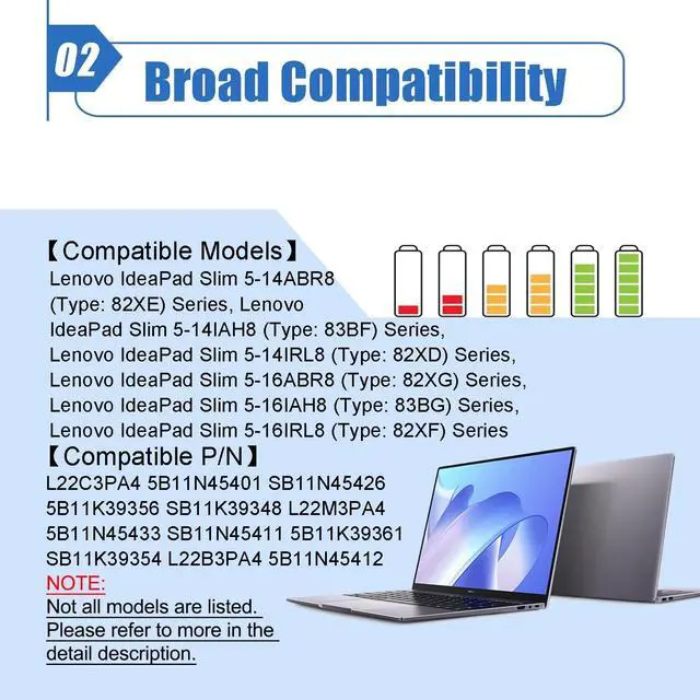 Battery Color: Black ^^ Compatible P/N L22M3PA4 5B11N45433 SB11N45411 5B11K39361 SB11K39354 L22C3PA4 5B11N45401 SB11N45426 5B11K39356 SB11K39348 L22B3PA4 5B11N45412 SB11N45438 5B11K39359 SB11K39351 L22L3PA4 5B11N45402 SB11N45393 5B11K39352 SB11K39364 ^^ Compatible Laptop ModelsFor Lenovo IdeaPad Slim 5-14ABR8 / 5-14IAH8 / 5-14IRL8 / 5-16ABR8 / 5-16IAH8 / 5-16IRL8 Series ^^
