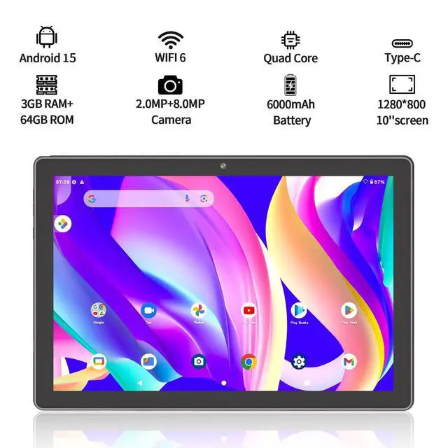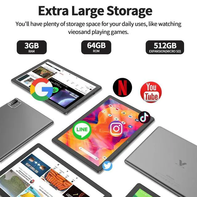 10 inch Tablet Android 15, VOLENTEX 64GB Storage (Expandable 512GB) 3GB RAM Tablet64GB ROM, 3GB RAM ( expendable up to 512GB ) Android 1510 inch HD screenFront 2MP / Rear 8MP Dual CameraWhat's in the
