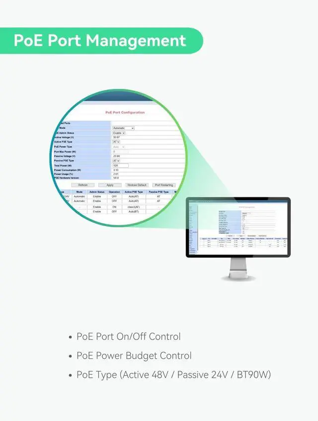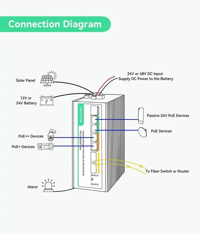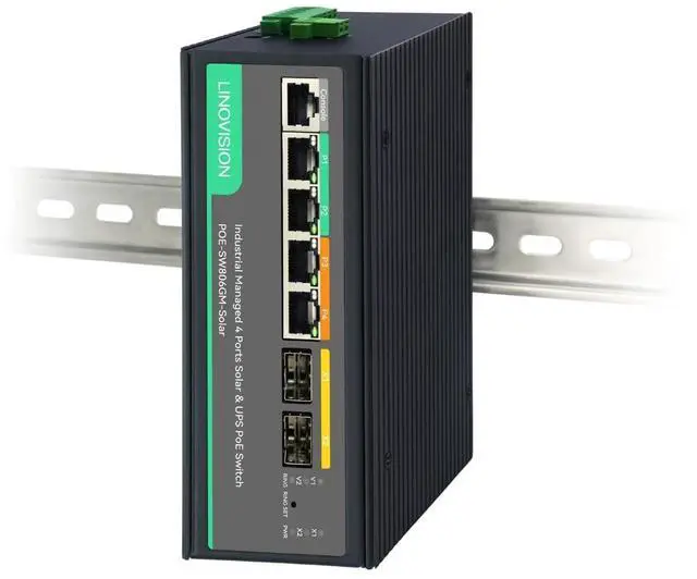 Port 3-4: Up to 802.3 bt PoE++ 90W output; Total PoE budget 120W. ^^ SMART BATTERY MANAGEMENT - Local battery status LED indicator and remotely battery management, compatible to battery types (Lead Acid, Lithium or LifePO4 Lithium batteries), 12V or 24V up to 10A. ^^ L2 MANAGEMENT - VLAN, STP, Link Aggregation, QOS, MAC/IP Based ACL, etc. Managed via WEB GUI, CLI or SNMP ^^ ALARM I/O - Support alarm input and trigger alarm output by temperature sensor, PoE device offline, etc. ^^ REMOTE CONTROL - Low voltage cut-off protection, intelligent PD alive check, PoE On/Off controll or PoE output schedule ^^ INDUSTRIAL DESIGN - Designed for harsh environment (-40 ~ 176 ), Fanless metal enclosure, 6KV surge protection, DIN rail mount