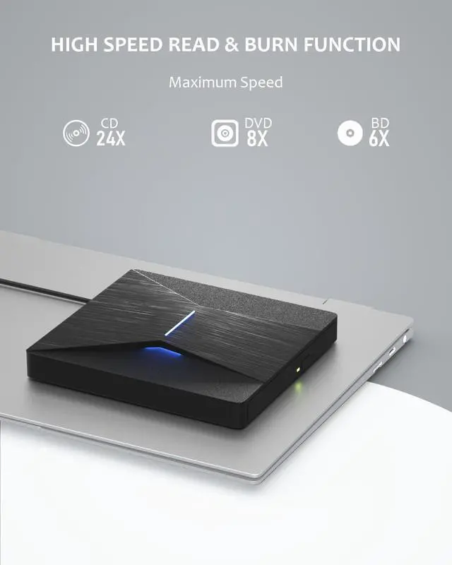 BD CD DVD Drive Burner--- This external bluray drive can not only read to Bluray CD DVD disc but also write them. Its ability to read and write bluray CD DVD discs with fast speed ensures that large files will be handled with ease and efficiency. It has a larger storage capacity (50G) which make it burn files with high performance. Bluray reading and writting speeds are up to 6x, DVDs up to 8x, and CDs up to 24x. Supports 8.5G 4.7G 700M CD DVD burning capabilities. Advanced high speed 3.0 interface, up to a maximum of 5Gbps(6X faster than 2.0 (480Mbps) )