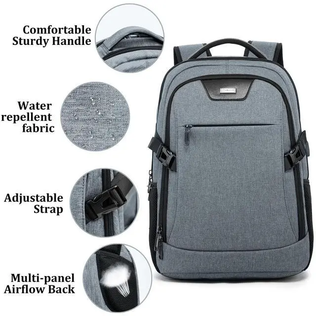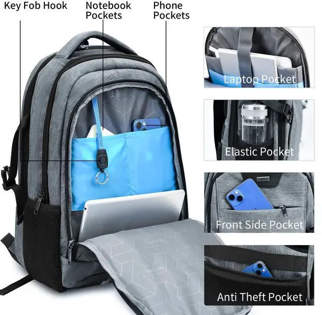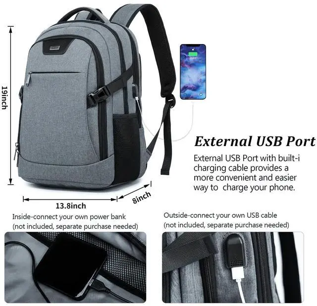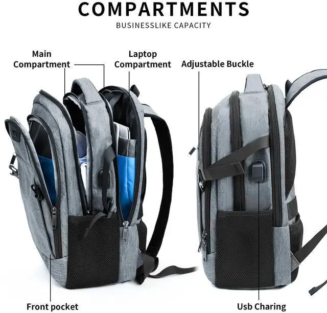 Large Capacity- the laptop backpack features compact desgin, size: 19 Inch* 13.8 Inch*8 Inch. Large capacity on main compartment so daily necessities and tech electronics accessories can be put together if you need. Easy organized and access. ^^ USB Charging Port - With USB Charging Port, the business backpack for men make you easiler charge your phone when you are outdoor walking or riding, running, hiking, camping. ^^ Multi-Compartmen-backpack with laptop sleeve. Main compartment comes with 2 inside pockets, 1 pocket fits your 15.6 inch laptop as well as 15 Inch, 14 Inch and 13 Inch Laptop. Front compartment comes with 5 insde pockets for your small items, 1 front zipper pocket comes with 2 small pockets inside and a key fob hook. 2 side pockets for your water bottle or umbrella. multi function, can be used as a daily backpack, business work backpack, travel backpack, traveling backpack. ^^ Comfortable when carry- Breatheable decompresson material on the backside and adjustable shoulder strap, when you carry this laptop backpack, it will no fatigue and protect your spine. The backpack features luggage sleeve on the backside, fits all size of luggage, release your hand when you are travel outside.