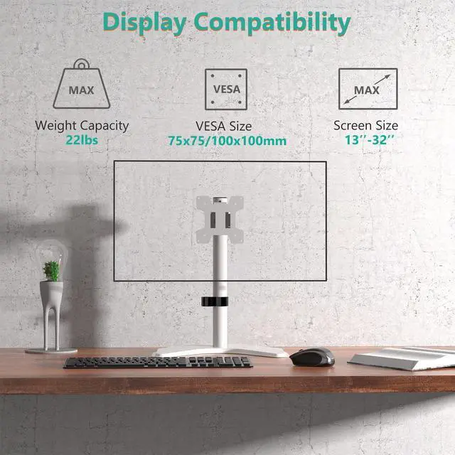 Compatibility: This single monitor stand fits Most Monitors, TV up to 32", 22 lbs. Mounting holes 75x75mm or 100x100mm detachable and height adjustable (up to 18). VBase ( 15.4 * 11* 0.8 inches).