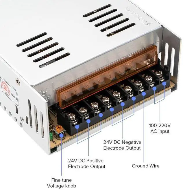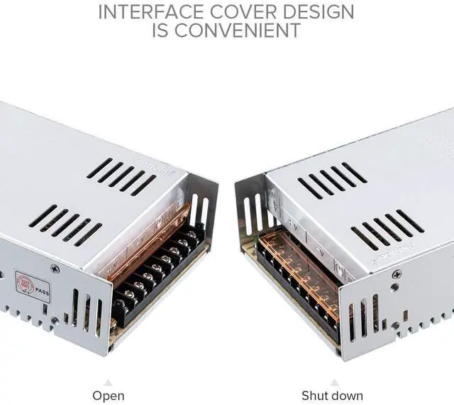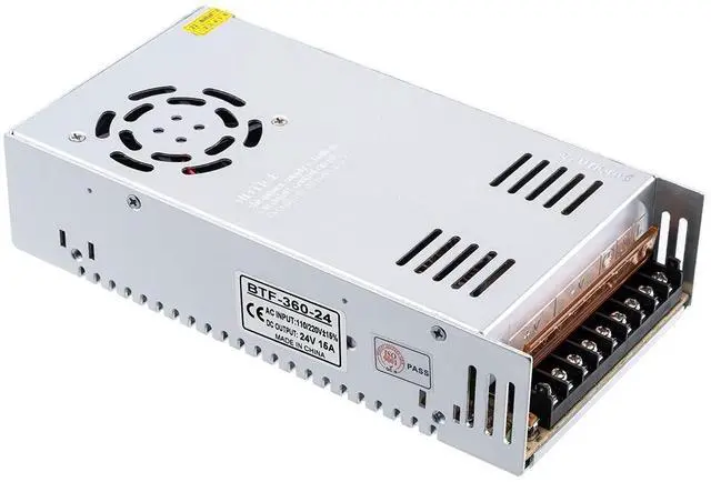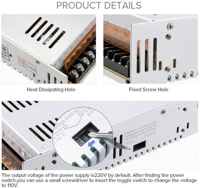 Output: 24V DC up to 15 Amps Max; The output voltage can be regulated by 10%, from 23.5V to 24.5V, Works with device that draws less than 15A, such as DC24V1A~15A. ^^ The default input voltage is 220V, 110V/220V must be selected by switch before using to avoid damaging. Please replace the switch with the voltage appropriate for your project. High-quality raw materials, porous metal shell, good heat dissipation performance, small size, strong performance stability, only support indoor use. ^^ Make sure your device match the 24V voltage and wattage less than 360W. Please dont run it overload. The max use should be no more than 80% of the full loads, otherwise, Its cause the power supply to overheat, the service life of the power supply will be greatly shortened. We recommend you to use this 24V15A 360W power supply to power devices less than 288W.