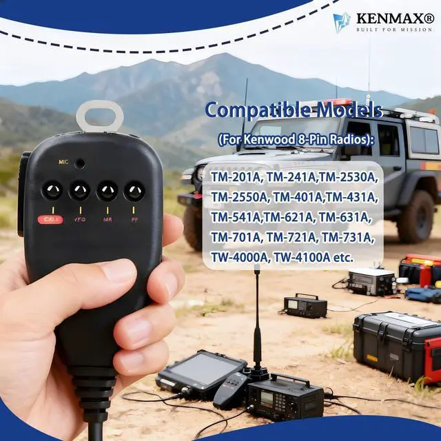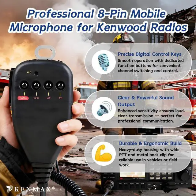 KENMAX 8-Pin Speaker Microphone for Kenwood Mobile RadiosThis durable wired speaker microphone is designed for clear audio, stable performance, and wide compatibility with Kenwood 8-pin mobile radios. Features a reliable PTT button, built-in speaker/mic, function keys, and a sturdy metal back clip for convenient daily or professional use. Hands-Free Clip DesignThe metal back clip attaches to clothing for hands-free operationideal for vehicle use, dispatch work, and mobile communication. Durable Cable & 8-Pin PlugEquipped with a strong cable and standard Kenwood 8-pin modular connector for a secure, interference-free wired connection.