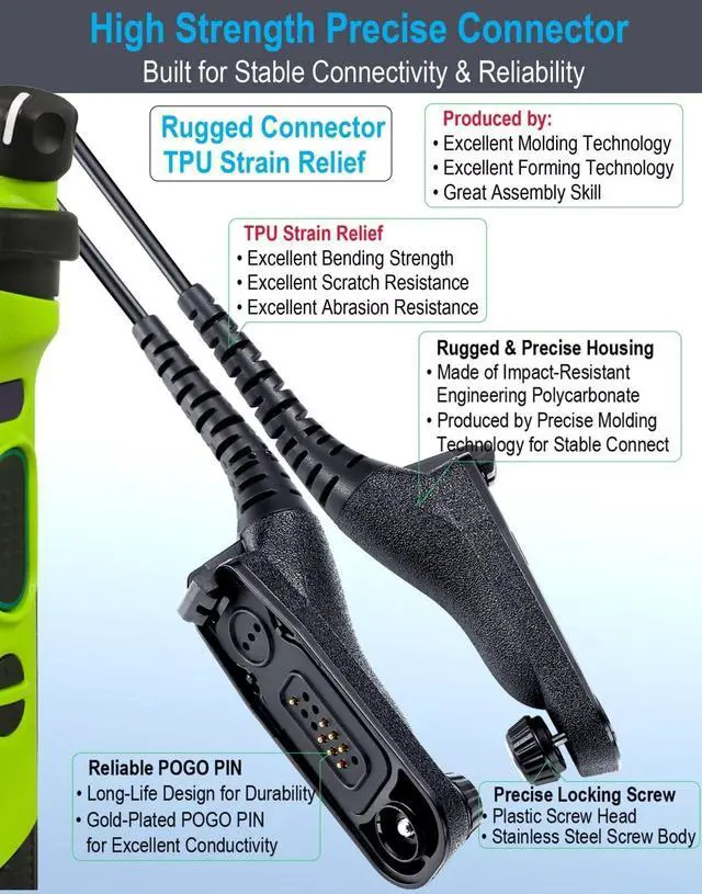 Strength Precise Connector: With TPU (Thermoplastic polyurethane) rubber jacket, engineering Polycarbonate housing, internal hard core and gold-plated POGO-pin, assembled by precise soldering technology and molding technology, the connector of this earpiece is built for stable connectivity and excellent operating life.