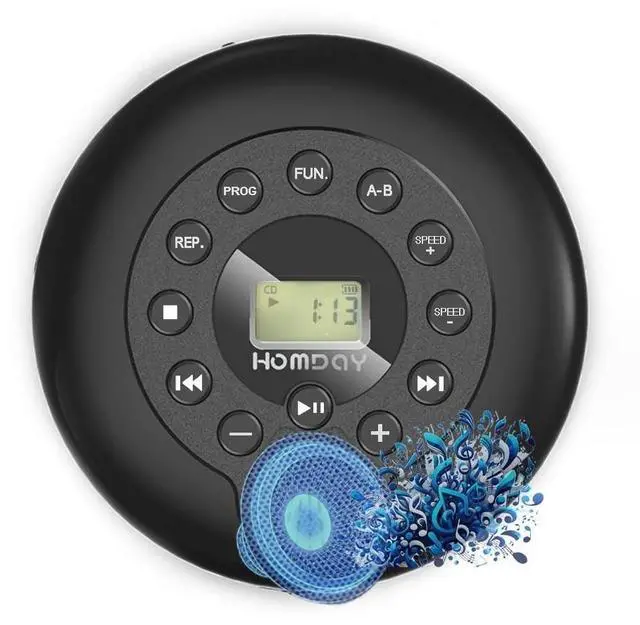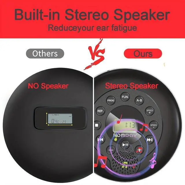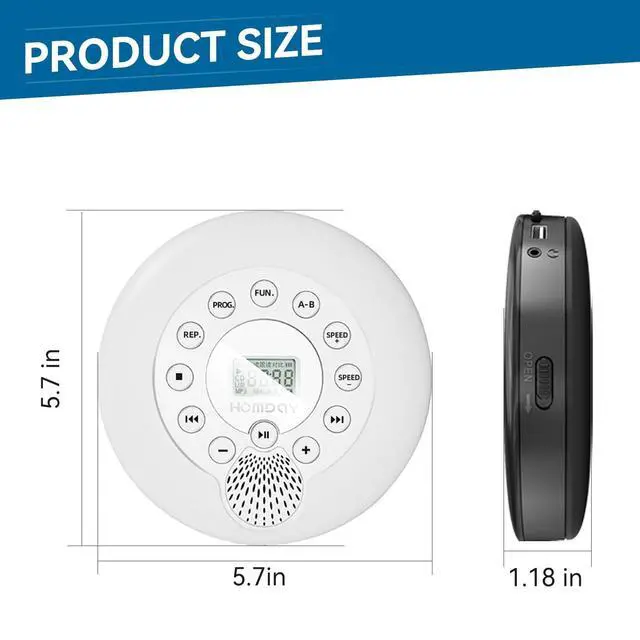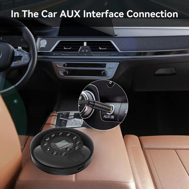 1500mAh Battery Rechargeable CD PlayerThis portabel CD player has a built-in 1500mAh Li-ion battery, no need to use AA batteries or always plug the charging cable into the cd player when playing music. ^^ Wide Compatibility CD PlayerThis portable cd player can support most CD formats, such as CD, CD-R, MP3 discs, WMA audio files of CD. It is a great car cd player for travel, when you drive the car outside with your family or friends, you can share music together on the road. AUX connection with all other audible devices via 3.5 mm audio input, such as external speakers and cars with 3.5 mm AUX jacks.