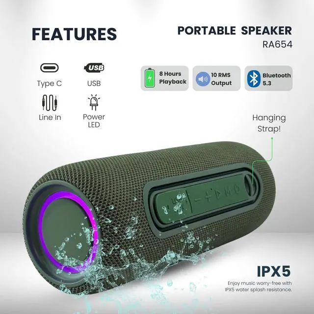 Loud and Clear Stereo Sound with Extra Bass - Feel the beat with Bassboom technology that delivers rich, deep sound and powerful volume for both indoor and outdoor use. ^^ Seamless TWS Pairing for Bigger Sound - Pair two RAS01 speakers together for a true stereo experienceperfect for parties, movie nights, or gatherings. ^^ 8 Hours of Non-Stop Music - Enjoy uninterrupted music with a long-lasting battery that keeps the fun going for up to 8 hours on a single charge. ^^ Water-Resistant and Built for Outdoors - IPX5 rating makes it splash-proof and durable, ideal for use at the beach, poolside, or during light rain.