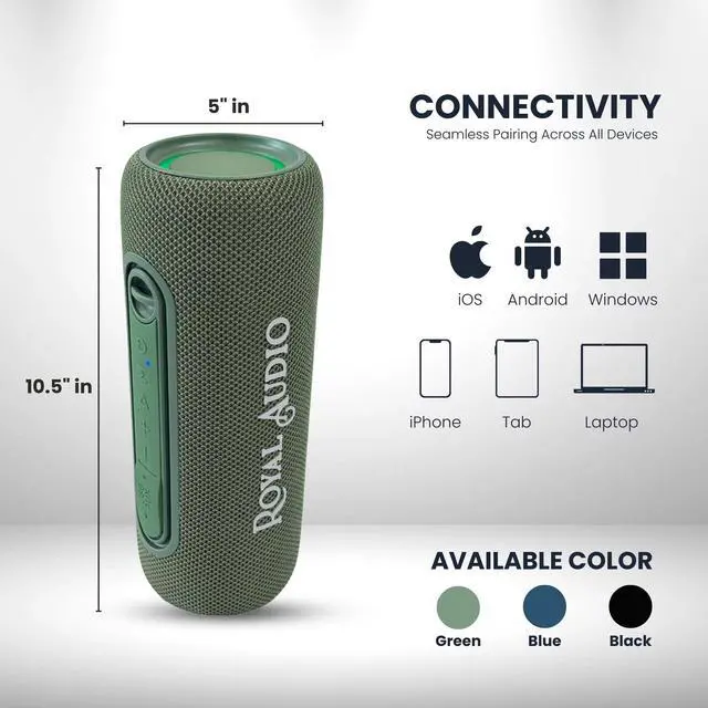 ROYAL AUDIO RAS01 Wireless Portable Bluetooth Speaker with IPX5 Waterproof Design, Bassboom Stereo Sound, TWS Pairing, 8 Hours Playtime, RGB Lights and FM Radio for Home and Outdoor Use (Green)