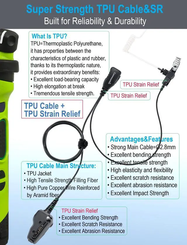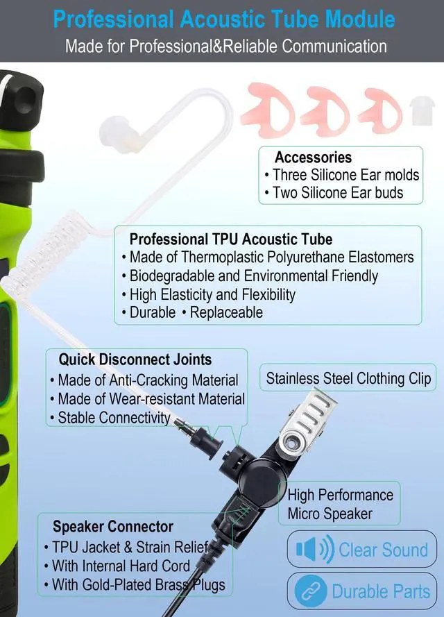 Commountain Single Wire Surveillance Earpiece/Headset KitFeatures: -Single Wire Surveillance kit with Quick-Disconnect Acoustic Tube-Surgical Grade UV Resistant Acoustic Tube, Comfortable & Durable-TPU cable Reinforced by Aramid Fiber, High Strength & Durability-High Quality Speaker & Microphone Enable Sound to Be Transmitted Clearly Even in Loud Environment-Rugged PTT/Mic with High Feedback PTT Switch&Stainless Steel Swivel Clothing Clip-Rugged Connector Made by