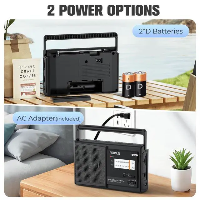 AC Plug & D Battery OperatedNo need to worry about changing batteries all the timethis AM FM portable radio runs on both AC power and 2 D batteries, giving you flexibility no matter where you are. Keep it plugged in at home for easy listening while cooking, or grab it with the batteries when youre outside or facing a power outage. Simple and practical for every occasion. (Note: D batteries are not included.)