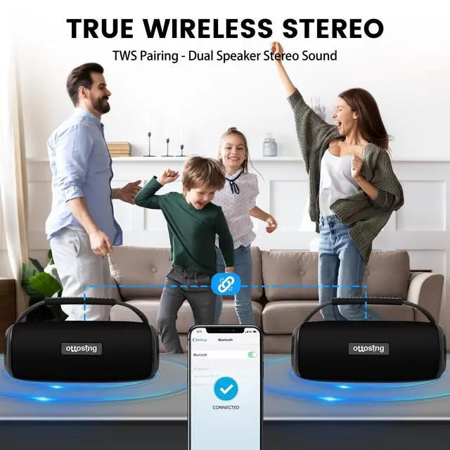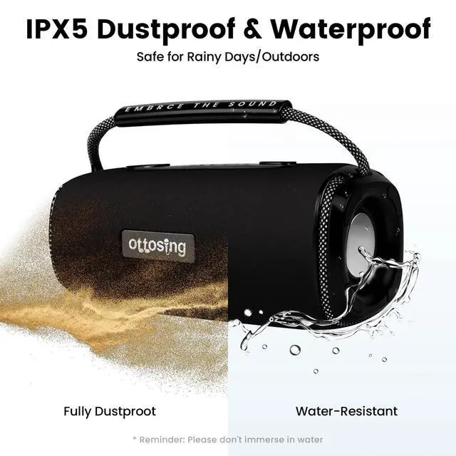 IPX5 Waterproof speakers - ottosing Bluetooth speakers are rugged and durable, IPX5 waterproof and dustproof, and suitable for shower rooms, pools or beachsides. Make it the perfect choice for outdoor adventures. Perfect for parties, poolside parties, beach trips, camping or hiking, this lightweight portable speaker is easy to fit into your backpack, stick to your bike, or hang anywhere with a braided carry belt. ^^ TWS Connection, Multi-Format Compatibility- Rich Features and
