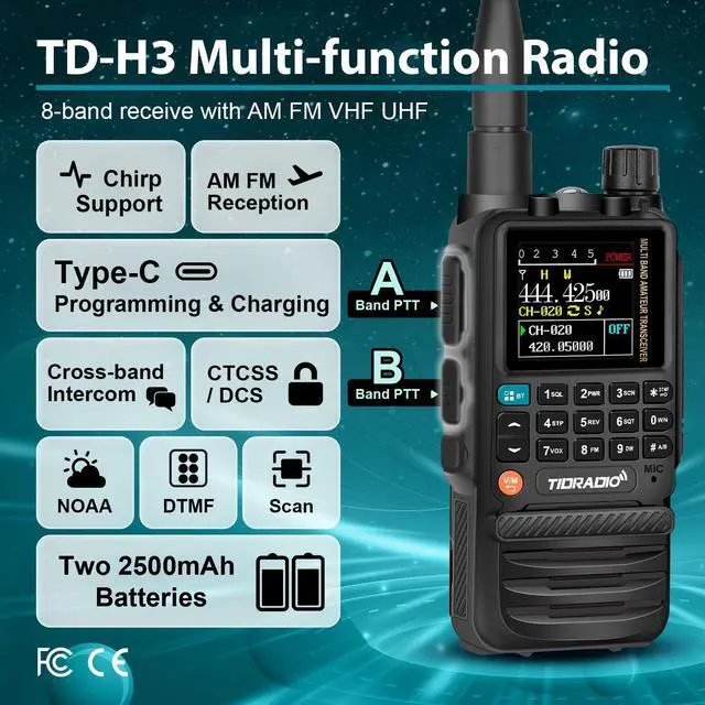 Product Code: TD831) ^^ Comprehensive SupportIf you are facing any problems with the Tidradio H3, especially the battery, enjoy peace of mind with our dedicated technical team ready to assist you with any issues. Contact us via email for a satisfactory solution.: - -, '. ^^ Features Designed for ExcellenceOn the basic functions of ham radio, Tidradio H3 boasts a host of innovative features including 8-band receiving band (AM/FM reception), wireless programming, wireless radio replication, One Key Match frequency, One-click to Import Local Repeater, DTMF function, MIC gain, frog end tone, and a 1.44 -inch TFT color screen, among others. Enjoying customizable radio settings. ^^ Comprehensive Frequency CoverageTaking advantage of the TD-H3's technical to explore a wide range of frequency, supporting 8 Band frequency