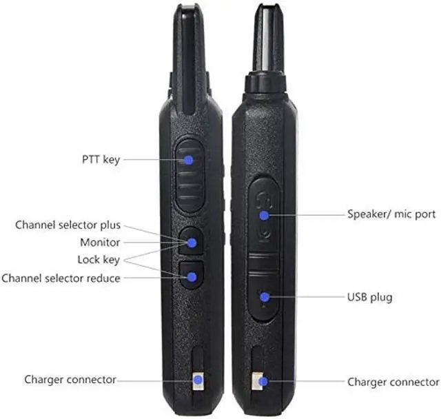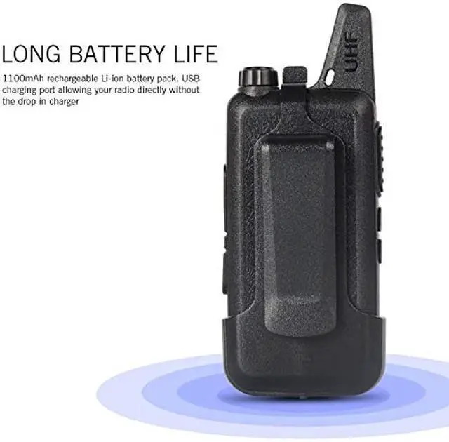 Net weight: 113g/ 0.25 lb; solid built; water-resistant; easy to operate for all ages; 3 Wattage power output; each radio has a removable belt clip and charger ^^ Frequency range is UHF 400-470MHz; 16 pre-programmed channels; each radio has identical frequency on each of the 16 channels out of the box; 16 position mechanical rotary switch channel selector; when you turn the knob to change the channel, a synthesized voice will tell you the channel number; channel frequency is programmable within the frequency range; you can program any of 50 CTCSS tones and 105 CDCSS tones on each programmed channel ^^ Each radio comes with a 1100mAh rechargeable Li-ion battery, it takes about 3 hours to fully charge; standby 2-5 days depending on how much you transmit ^^ High quality built-in speaker on the radio provides loud and crystal clear sound; Push-to Talk button and built-in mic on the radio; each radio comes with a single-earbud style earpiece with a microphone built in and a Push-to-Talk button; when you plug in the earpiece, all sound goes to the earpiece and the radio speaker is silent; the radio has a VOX function ^^ Falling-resistant 1-3M, tested transmission range up to 30 floors, less in congested area; work great in a commercial construction or around the house; suitable for security team; maintenance team; construction team; fire department; warehouse; factory; kitchen staff; hotel; retail store; at the school; events communications; roadtrip while driving in different cars; family camping and hunting; on a cruise ship; in mountains; it works worldwide; you can add as many as you want and they work great together