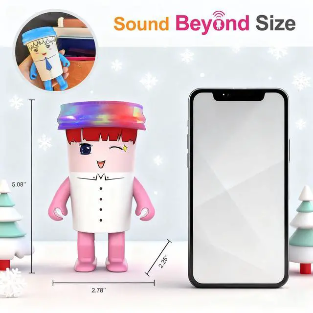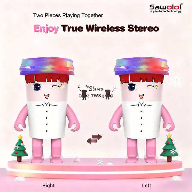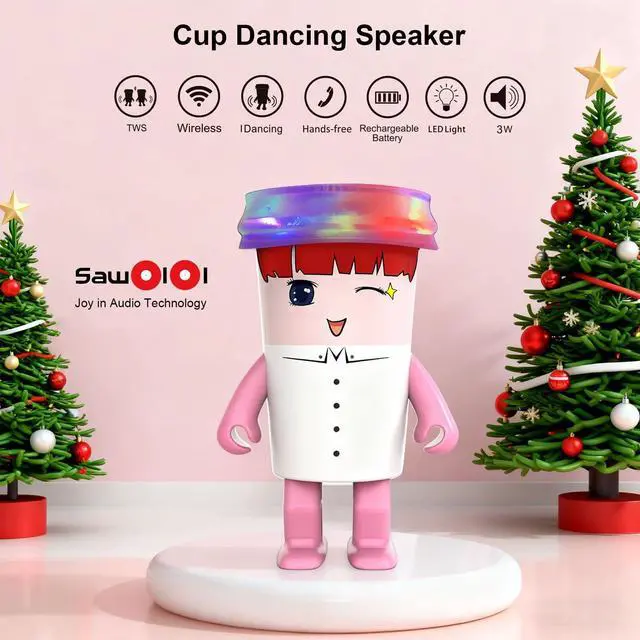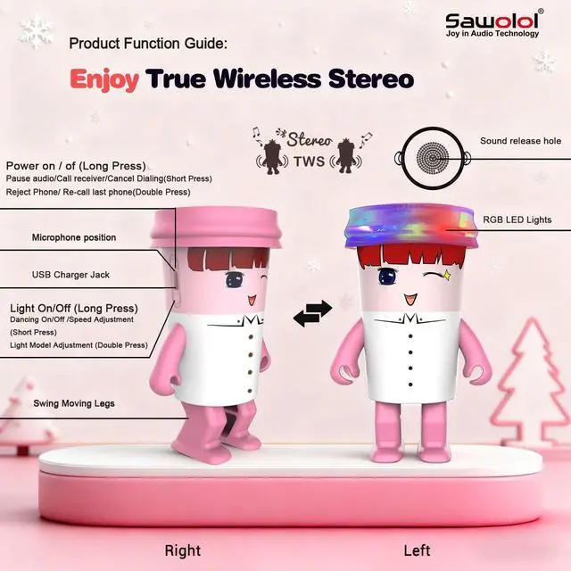 Cute Swing Dancing Robot Speaker Sawolol Sweet Girls cartoon design dancing speaker is a cute bluetooth wireless robot small speaker, that will dance while the music is playing, dancing speed be manually adjusted, providing happy emotional values and audio experiences to release pressure suitable for big kids, student, music lover, Fashionable people to relax mood and enjoy quality music life. (not a toy). ^^ Dynamic RGB Atmosphere LightsSawolol Fruits Dancing speaker has RGB lights, and the color of the light changes with the rhythm of music while the robot speaker is playingAn interesting and joyful atmosphere, making it a pleasant supplement to any room for listen to music and a small party, this cool LED Bluetooth Speaker can be as a birthday gifts for big kids, teens, student.