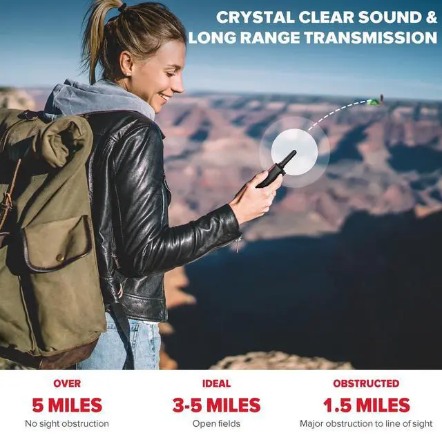 UNLIMITED COMMUNICATION TIME The rechargeable walkie talkie supports micro USB charging. You can charge them indoors, on the road, and even camping and hiking, and you do not need to pay for batteries, again and again, saving stress and money for you. ^^ LONG RANGE TRANSMISSION AND CRYSTL CLEAR SOUND With upgraded custom helix gain antenna, super penetration, and lossless transmission technology. You can speak clearly and your kids can hear clearly within 1 mile in the yard or indoors. Longer range communication in open areas with little or no obstruction.