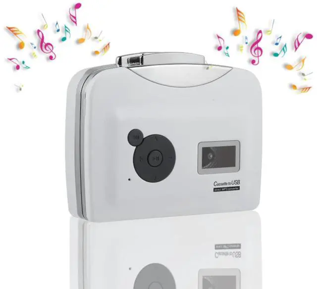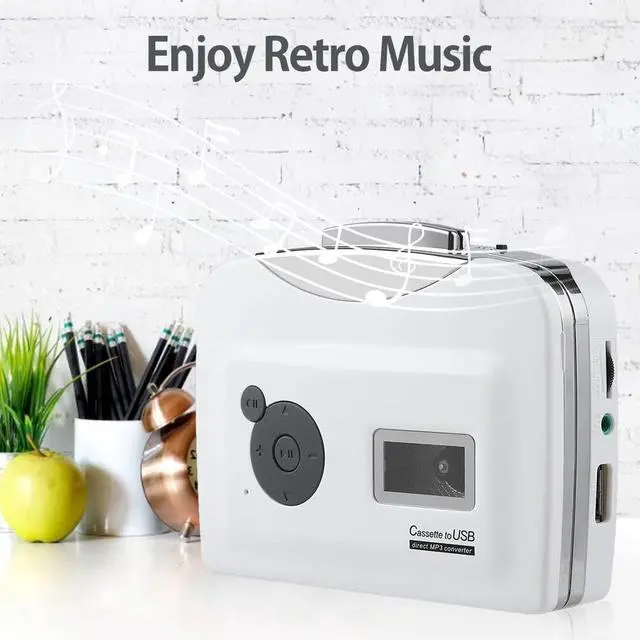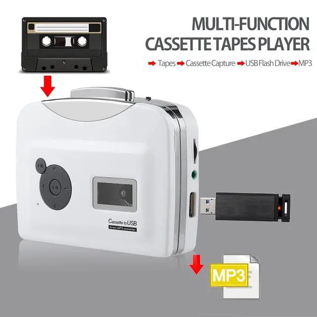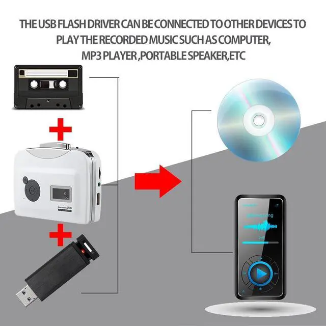 Cassette to MP3 Converter - Lightweight and portable. ^^ Cassette capture can can directly transfer your old cassettes or tapes to your USB Flash Drive (NOT included) in MP3 format. ^^ The USB flash driver can be connected to other devices to play the recorded music such as computer, MP3 player, portable speaker, etc. ^^ You can play the tape with this cassette capture, and the cassette capture can also be used as a music player. ^^ Easy charging - Support battery powered and USB powered.