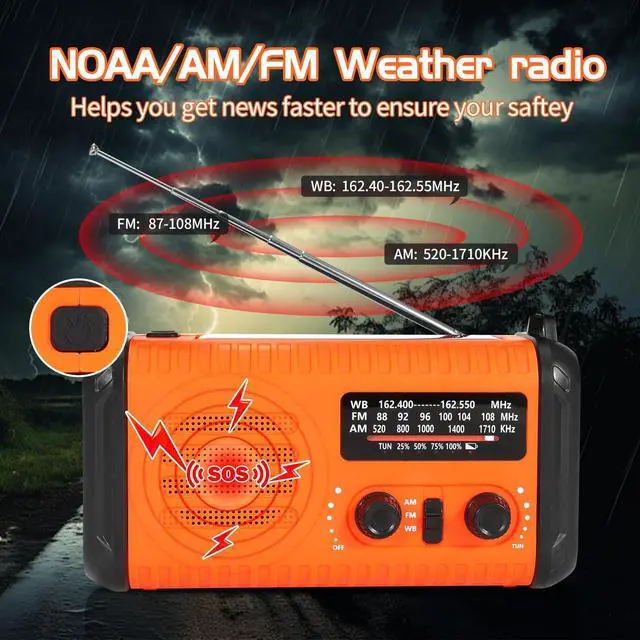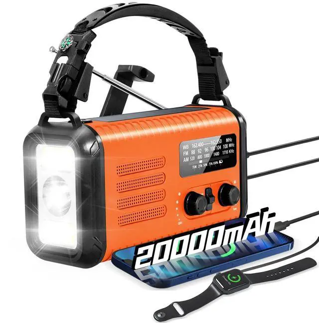 20000mAh LARGE BATTERY-Our radio Equipped with a powerful 20000mAh (74000mWh) rechargeable battery, Very efficient in both charging and discharging. When we are trapped in trouble, this emergency hand crank radio with a 20000mAh big battery may be our life-saving tool. It supports charging 2 devices at the same time. It can also be used as a backup power charger at ordinary times ^^ AM FM NOAA Emergency Weather Survival Radio-Equipped with an advanced DSP chip, this emergency radio reliably receives critical weather and hazard alerts from 7 NOAA channels. Be prepared for unpredictable weather events like hurricanes and winter storms.