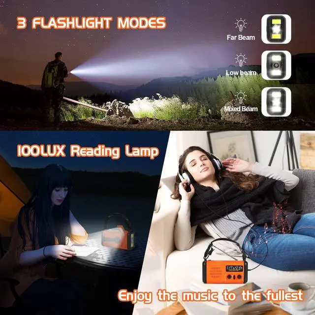 Our radio has 4 modes of flashlight high beam low beam mixed beam and SOS flash mode to meet your different lighting needs. Press and hold the "SOS "button to trigger a loud alarm and flashing lights, quickly attracting attention and facilitating prompt assistance. ^^ All-in-one Portable Weather Radio- It can also be used as an entertainment tool. If you like outdoor activities, you can use it to play music and listen to some humorous news content with your friends. It is also equipped with a headphone jack, so you can also quietly listen to the music you want to listen to alone, enjoy the happy outdoors, This radio comes with a compass and hand strap, perfect for outdoor camping, wilderness survival, hiking, trekking, and nighttime biking.