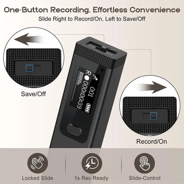 One Slide Recording: Operates intuitively. Slide right to instantly start recording; Slide left to securely save files and power off. Zero configuration required - eliminating the complex button layouts common on conventional voice recorders. Capture critical dialogue with zero latency ^^ CrystalClear DSP 4.0