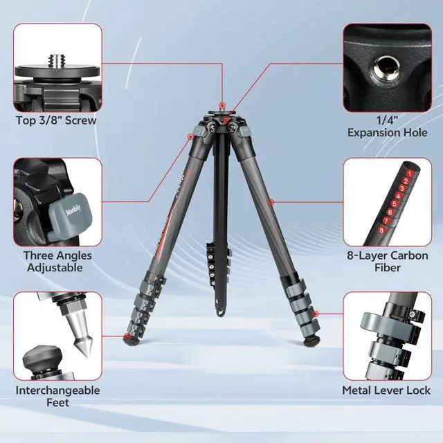 PH-10 TripodMaterial: Carbon FiberThis tripod features one-hand metal buckle adjustmentfaster & sturdier than plastic knobs, with stronger locking force and zero breakage risks. Ball headl-free design lets you customize with your gear or pick Manbilys matching kits. Crafted from 8-layer carbon fiber, its