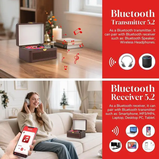 • Vintage CD Player with Dual Bluetooth:Equipped with advanced Bluetooth 5.2 technology, this vintage CD player supports Bluetooth transmitter and Bluetooth receiver Seamlessly connect to external Bluetooth devices in CD mode to stream your favorite music directly from your smartphone, tablet, or other Bluetooth-enabled devices. It can also be connected to headphones or external speakers via the 3.5mm AUX port to meet different audio output needs