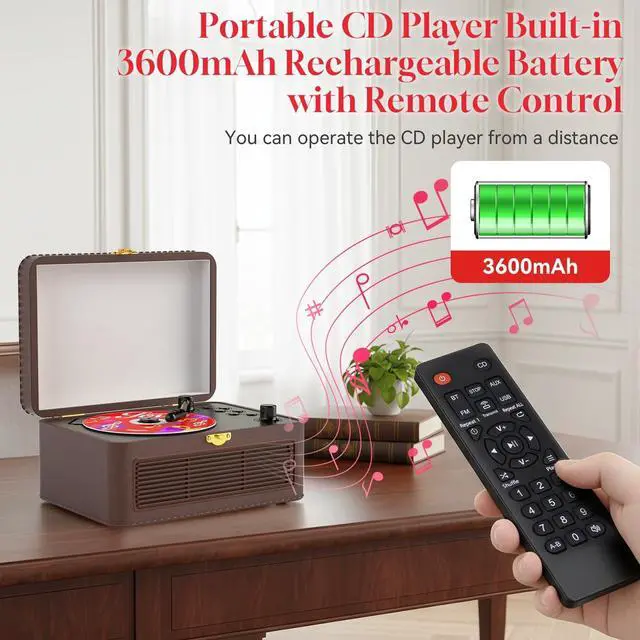 Dual Bluetooth: Equipped with advanced Bluetooth 5.2 technology, this vintage CD player supports Bluetooth transmitter and Bluetooth receiver Seamlessly connect to external Bluetooth devices in CD mode to stream your favorite music directly from your smartphone, tablet, or other Bluetooth-enabled devices. It can also be connected to headphones or external speakers via the 3.5 mm AUX port to meet different audio output needs ^^ Portable CD Player with 3600mAh