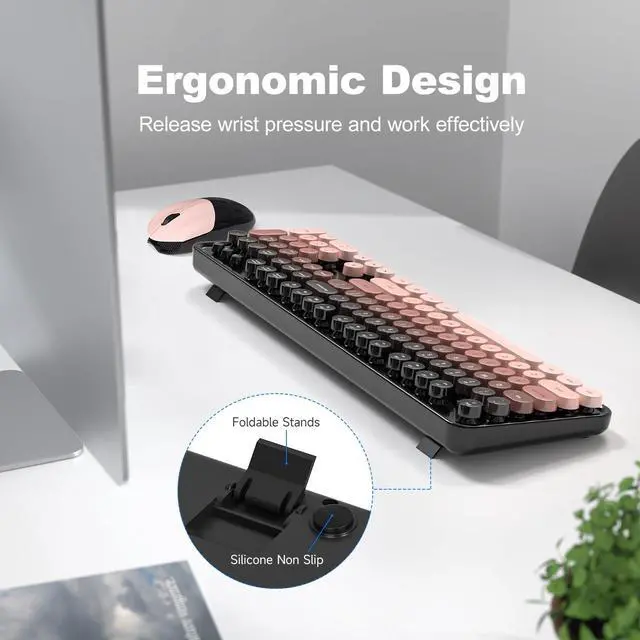 ^^ Ergonomic Design: The keyboard's foldable stand and anti-slip pads provide an optimal typing angle to reduce wrist strain, while the contoured mouse offers lasting comfort. Removable keycaps make cleaning hassle-free. ^^ Auto-Sleep Feature for Extended
