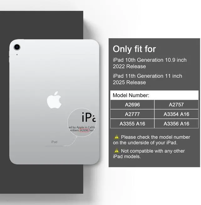 • Compatibility -- Designed specifically for iPad 11th Generation (A16 Chip 11 Inch, 2025 Release), Model numbers: A3354, A3355, A3356 & iPad 10th Generation (10.9 Inch, 2022 Release), Model numbers: A2696, A2757, A2777. Not compatible with any other iPad models