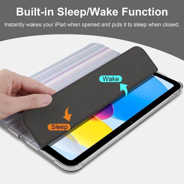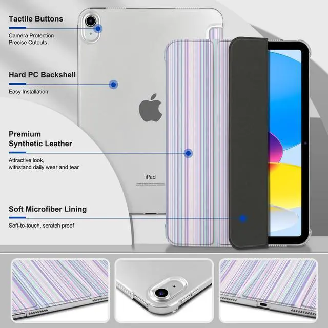 Model numbers: A2696, A2757, A2777. Not compatible with any other iPad models ^^ Auto Sleep/Wake Function -- Automatically puts your iPad to sleep when closed and wakes it up when opened, saving battery life. ^^ Trifold Stand -- Adjustable 3-fold design offers two viewing modes: one for media viewing and another for comfortable typing. ^^ Durable & Scratch-Resistant -- The case is made from high-quality PU leather and features a hard PC back, offering excellent protection against scratches and fingerprints. ^^ Transparent Hard PC Back & Soft Microfiber Interior -- The transparent, hard PC back allows you to display your logo while providing strong protection. The soft microfiber interior prevents scratches on your iPad screen and ensures safe handling.