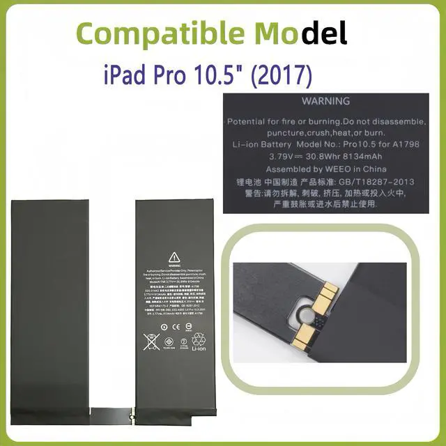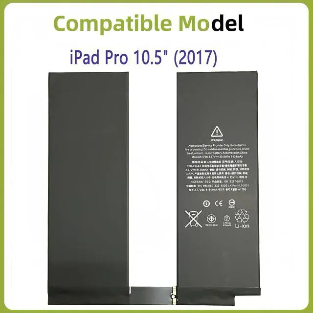 Battery Parameters: 8134 mAh / 30.8 Wh, 3.77 V3. Compatible withFor iPad Pro 10.5" (2017), A1709, A1852, A1701, MQDT2LL/A, PHH2LL/A, MQF22LL/A+4.