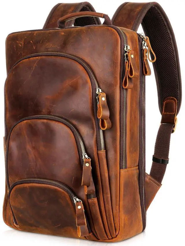 Full Grain Leather Backpack: The travel backpack is made of long lasting full grain cowhide leather and heavy duty metal zipper. The new zipper is a little tight at first to extend its life and will become smoother over time.
