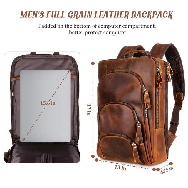 Dimensions: 17 (H) "x13 (L) "x 4.25 (W) ", Weight: 3.2LB. The use of high-quality materials and skilled craftsmanship make this backpack a reliable and stylish choice for everyday use. ^^ Well Organized & ConvenientVintage genuine leather backpack has many compartments to keep your phone, book, 15.6 laptop, tablet and any other necessities (umbrella, headphones, cosmetics) organized 1. The leather backpack will fit under the seat in an airplane. 2. It can stands up on its own without needing to be leaned against something. 3. The shoulder straps and back of the backpack are thick padding to spread out the weight. ^^ Perfect Gift Choice The vintage leather backpack is a bit bulky because of thick quality leather. Perfect for commute, office work place, travel, business trip, outdoor sports, hiking, camping, cycling, biking and other occasions. It can be used as computer laptop backpack, work backpack, travel rucksack backpack, daily daypack. Ideal choice as Christmas, Valentine's Day, Birthday, Anniversary, Ceremony, or Thanksgiving Day gifts for adult him. ^^ Practical Vintage Leather Backpack The back of the leather daypack is made of soft and breathable padding, whose concave and convex design conforms to ergonomics, sweat-proof, comfortable, and also weight balance to reduce carrying burdenyou can put the daypack safely on your suitcase so that you can travel easier.