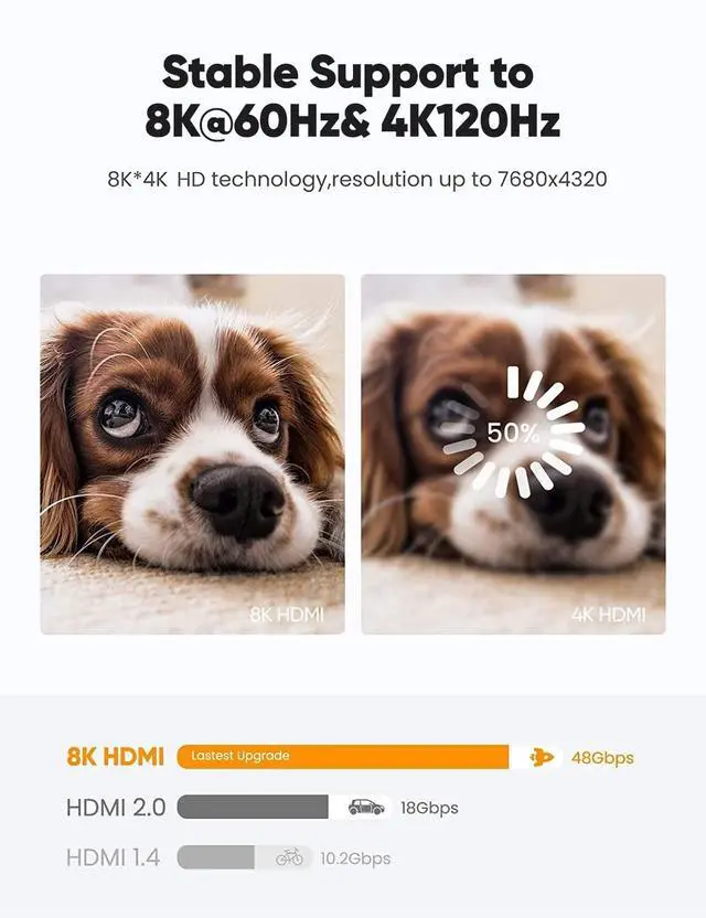For Game Enthusiasts: This 8K High Speed HDMI Cable can achieve a super smooth picture of 4K@120HZ. Its latest game mode supports variable refresh rate, maximizes the value of the graphics card and CPU to obtain a smoother and more detailed picture.