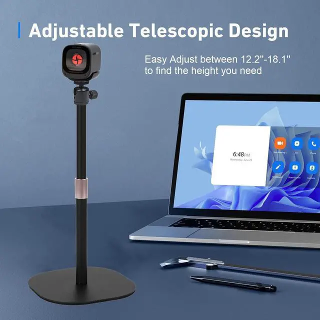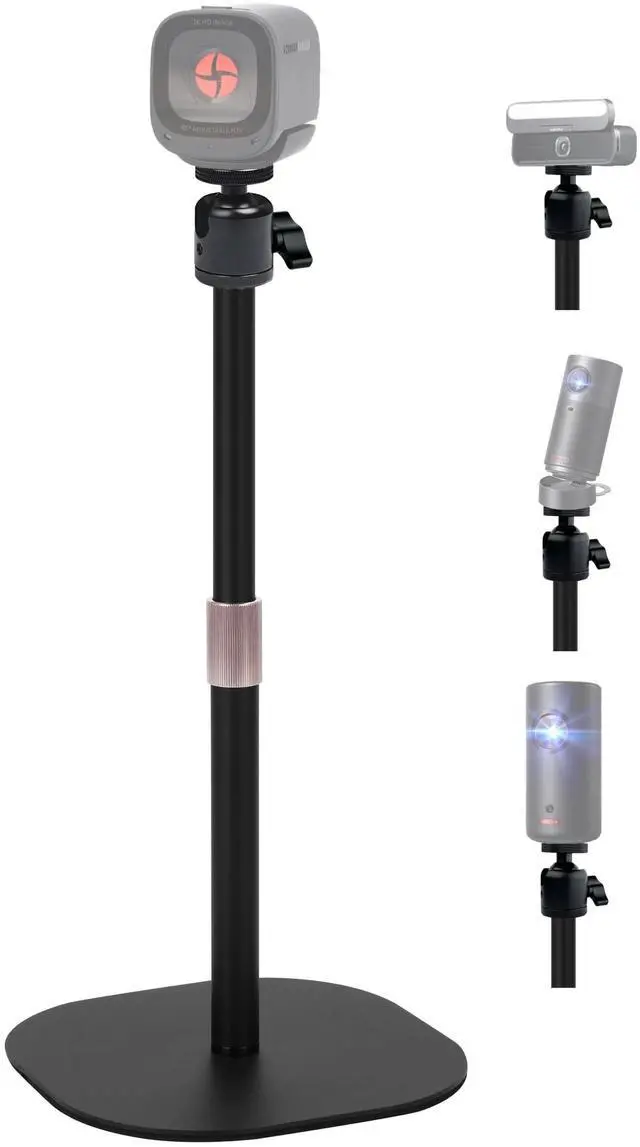 Heavy-Duty Webcam Stand: Perfect for your webcam, Mini Projector or Action cameras to Video Conference, Remote Work, Online Course, Zoom calling, Gaming, Live Streaming, Movies, Watch TV, etc. ^^ Product Total Height with ball-head adapter: 46cm/18 inches; Metal Base Dock diameter 22cm/ 8.66 inches; 2 Sections Folding Pole can easy to adjust height for your purpose; Product total weight 2.7 lbs to Stabilized support provided, Max load devices weight 2kg/ 4.4 lbs; ^^ Tabletop